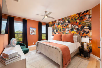 Creative wall flourishes run freely throughout the home. It’s hard to pick a favorite moment when there’s a lush Arte velvet wall inspired by childhood memories of Michigan Falls, a Hunt Slonem fluffy bunny vibe laundry room, a UFO-themed powder room, and a vibrant feline mosaic in the ultra-sleek master bath. After a day of play, the couple unwinds in the primary living space anchored by an oval-shaped sofa from Century Furniture and a striking Palacek clamshell table adding organic, sculptural details. The final escape is the serene master suite, offering a soothing retreat of soft lines, subtle hues, and luxe lighting.